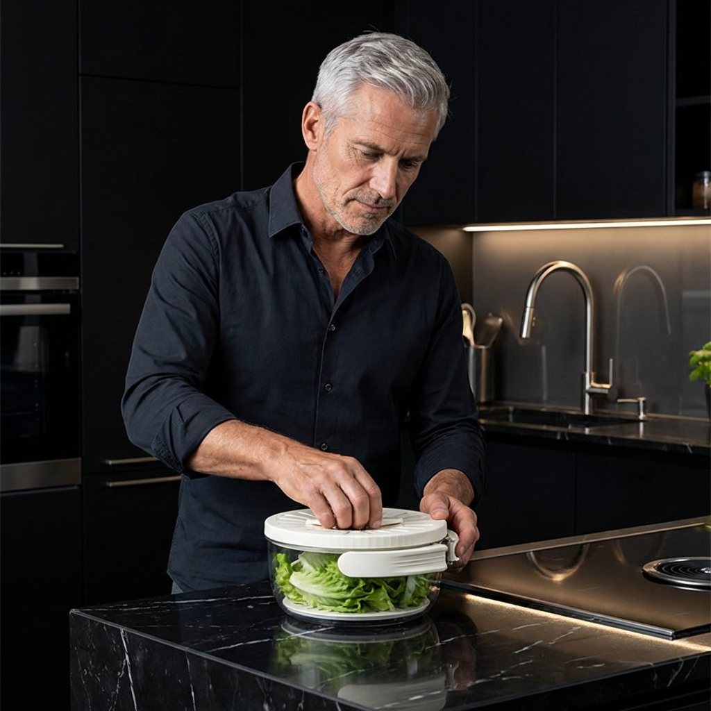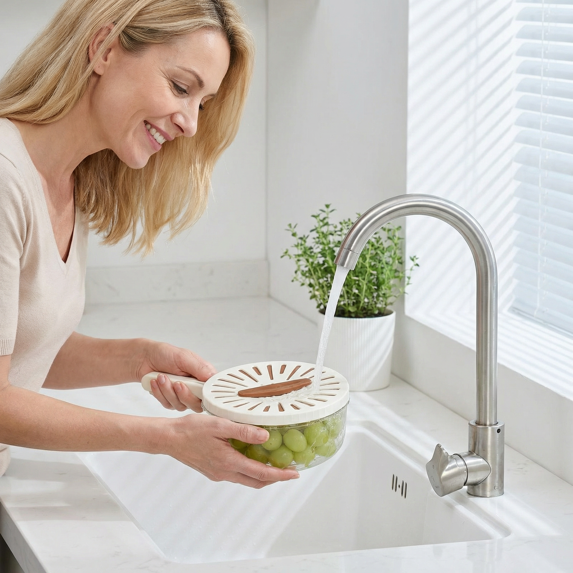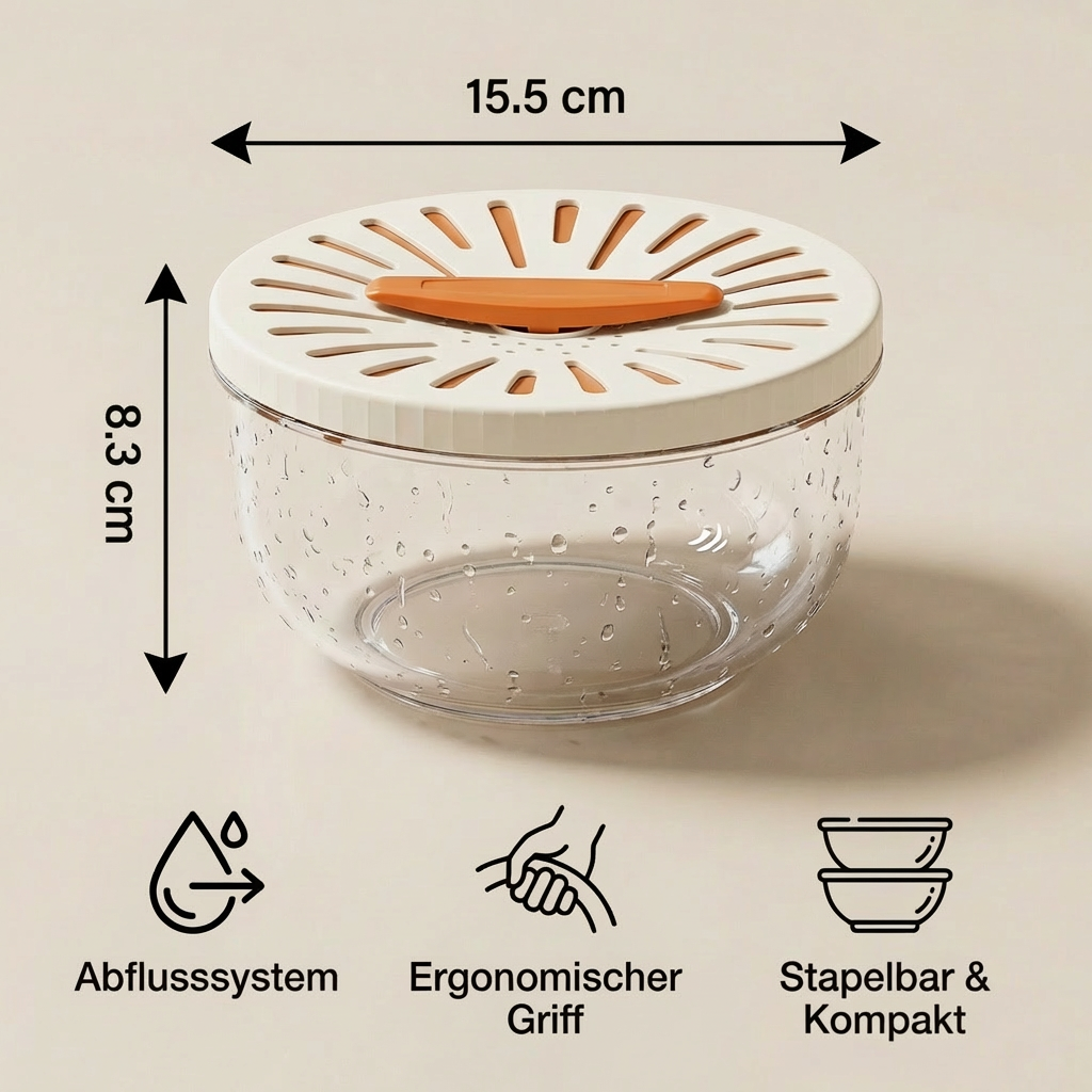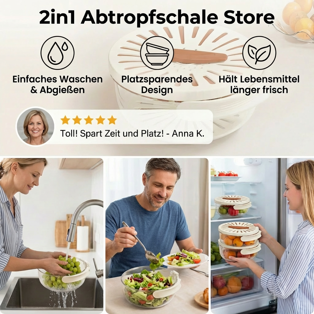 "Die 2in1 Abtropfschale ist super praktisch, da ich Obst und Gemüse direkt abtropfen und darin aufbewahren kann. Das Wasserablaufsystem funktioniert einwandfrei und spart mir viel Zeit in der Küche!"